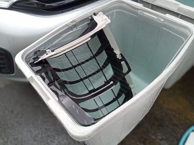 ファンは無数の羽が角度をつけて作られているため、非常に洗浄しいにくい形状になっており、高圧洗浄機を使用したりブラシでこすりますが、汚れが残っている可能性を考え、最後に60度以上のお湯でカビ菌を殺菌して仕上げます。