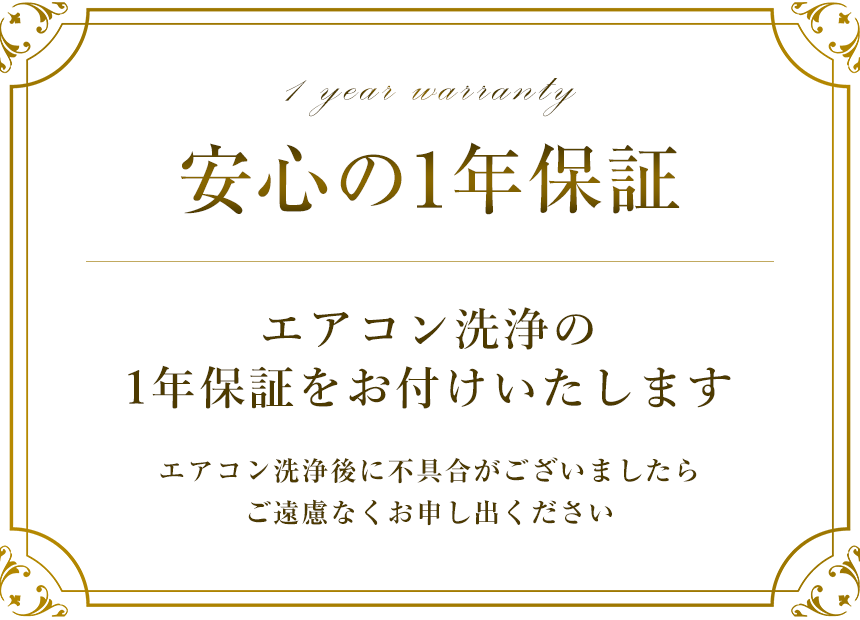 エアコン完全キレイ便では、お客様が快適にエアコンをご利用いただけるよう、洗浄には万全を期して作業させていただきます。だからこそ、自信を持って1年保証をお付けしています。